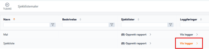 - I oversiktslisten over opprettede sjekklistemaler, trykk på knappen Vis logger på aktuell sjekklistemal.
