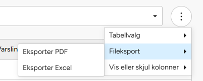 Du kan eksportere utvalgte data fra tabellen til Excel eller PDF.