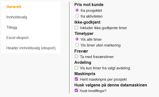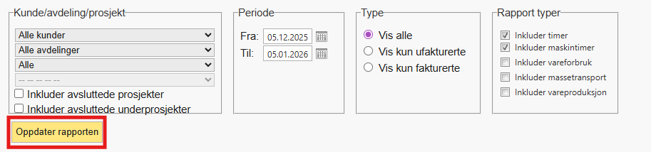 - Velg om du vil vise kun fakturerte, ufakturerte eller alle timer.