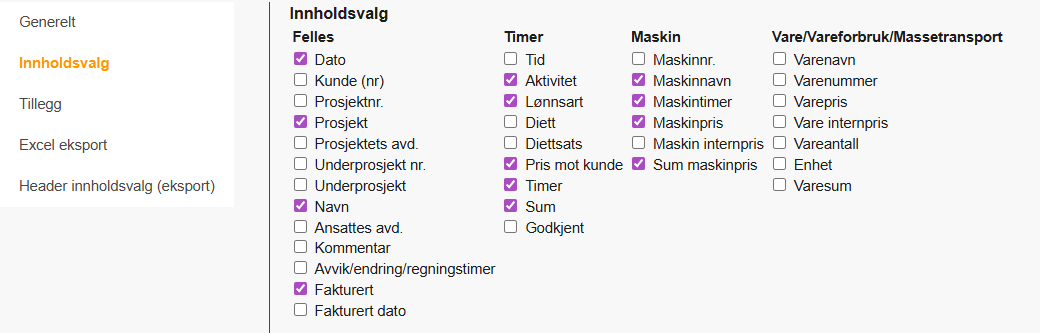 - Kryss av for registreringsfeltene du ønsker skal vises i fakturagrunnlaget.