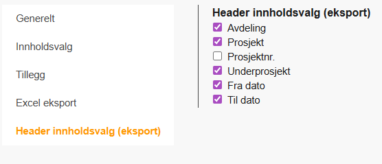 - Aktiver header for å inkludere prosjekt- og periodeinformasjon i eksporten.