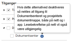 Når Dokumentsenter-tilgangen fjernes fra rollen, vil brukere med denne rollen ikke ha tilgang til dokumentmapper på firma-, prosjekt- eller maskinnivå i Dokumentsenteret.