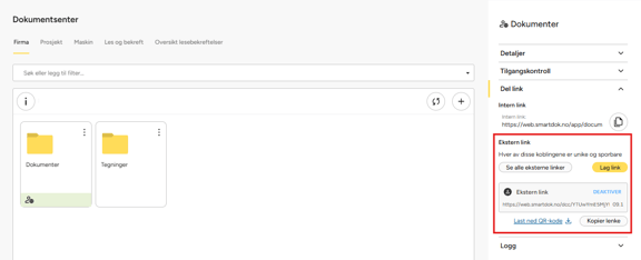 Dokumentmapper eller filer som deles via ekstern lenke er tilgjengelige for alle som har lenken.