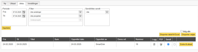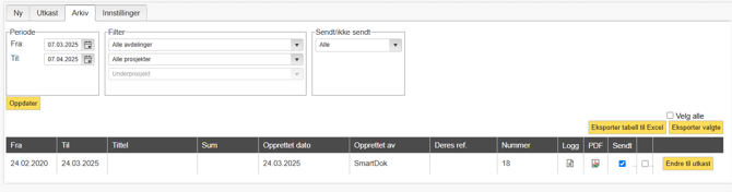 - Filtrere på dato, avdeling, prosjekt eller sendt-status