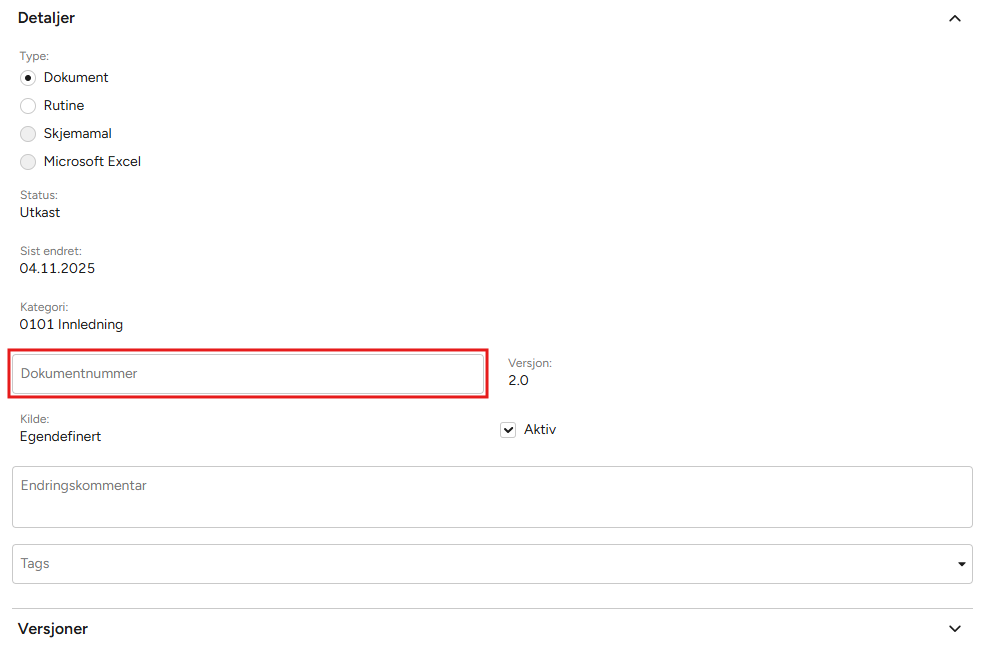 Tips: Dersom innholdet ikke skal endres, men du likevel ønsker å oppdatere dokumentnummeret, kan du legge til et ekstra mellomrom i teksten. Dette gjør feltet for dokumentnummer redigerbart.