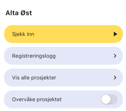 - Trykk på det aktuelle prosjektet → Registrer inn for å sjekke inn på mannskapslisten.