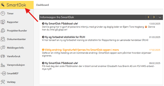 - Klikk på SmartDok-logoen øverst i venstre hjørne for å oppdatere siden.