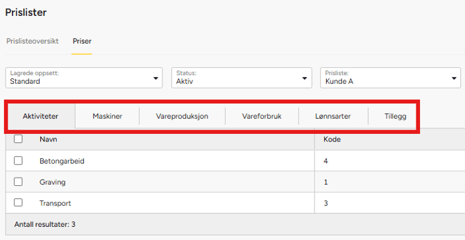Velg hvilket område du ønsker å redigere priser i (aktivitet, maskin, vareproduksjon, vareforbruk, lønnsarter eller tillegg).