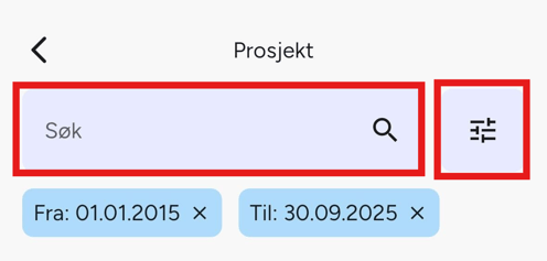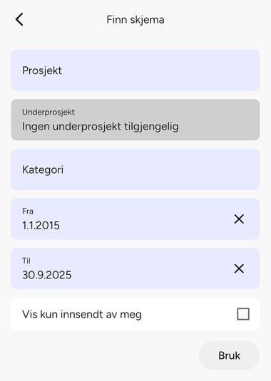 - Trykk på filter-knappen øverst til venstre. Tilgjengelige filter er: prosjekt, underprosjekt, skjemakategori, fra-til periode. I tillegg kan du velge om du kun ønsker å se skjema innsendt av deg selv.