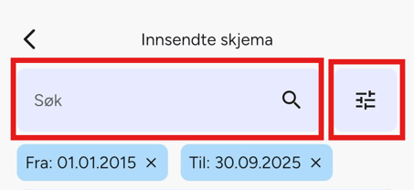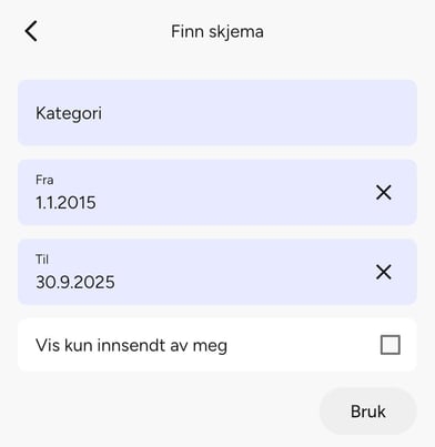 - Trykk på filter-knappen øverst til venstre. Tilgjengelige filter er: skjemakategori, fra-til periode. I tillegg kan du velge om du kun ønsker å se skjema innsendt av deg selv.