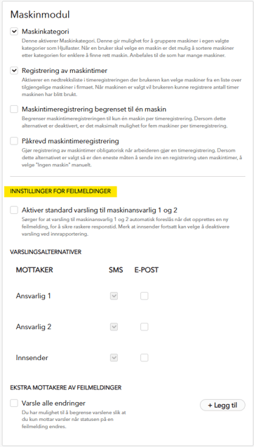 - Velg om det automatisk skal foreslås utsending av varsel til maskinansvarlig 1 og 2 ved oppretting av nye feilmeldinger.