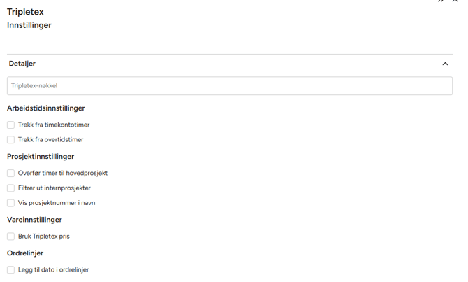 • Merk: Timekonto er ikke optimalt støttet i Tripletex-integrasjonen. Det kan fungere teknisk, men kan føre til differanser i timegrunnlaget mot prosjekt i Tripletex.