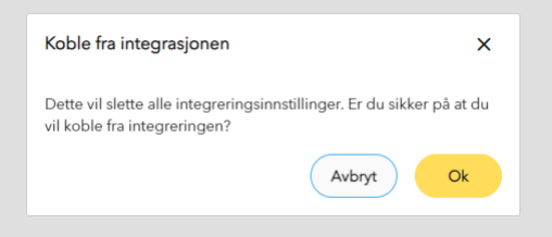 - Om man trykker på knappen for å koble fra integrasjonen kommer det en popup for å bekrefte at brukeren ønsker å slette integrasjonsoppsettet.
