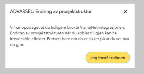 - Kobler man til integrasjonen på nytt igjen, og forsøker å endre prosjektstruktur, oppdager vi dette og advarer brukeren med en popup om at dette kan ha irreversible effekter.