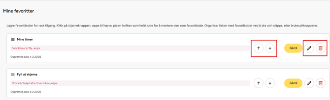 - Trykk på blyant-ikonet for å redigere navn på favorittside, pil-ikoner for å endre rekkefølge eller søppelkasse-ikon for å slette.