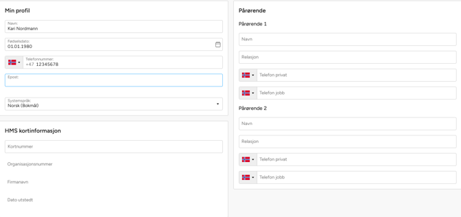 I SmartDok kan hver bruker oppdatere sin personlige informasjon under Mine innstillinger → Min profil, både på web og i appen. Dette gir en oversikt over dine kontaktopplysninger, språkvalg, HMS-kort og nærmeste pårørende.