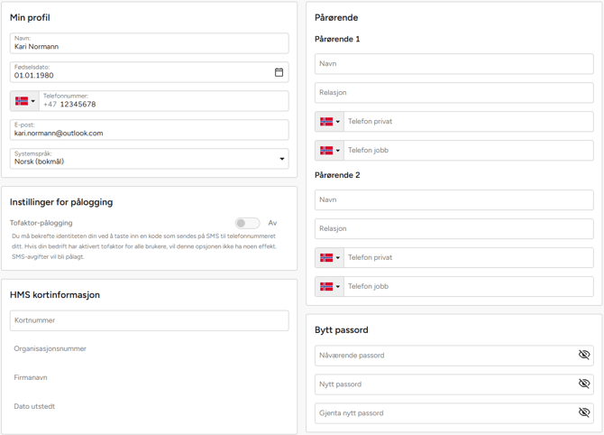 I SmartDok kan hver bruker oppdatere sin personlige informasjon under Mine innstillinger → Min profil, både på web og i appen. Dette gir en oversikt over dine kontaktopplysninger, språkvalg, HMS-kort, nærmeste pårørende og mulighet for å endre passord.