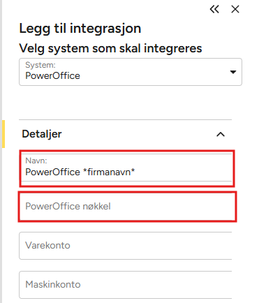 Eksempel: PowerOffice + firmanavn (eller annen tilleggsinformasjon). - Legg inn integrasjonsnøkkel fra regnskapssystemet.