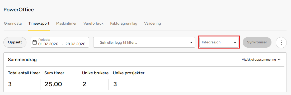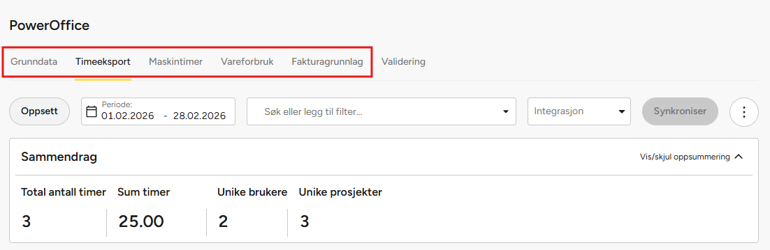 - Velg riktig fane basert på hvilken data du ønsker å synkronisere (grunndata, timer, maskintimer, vareforbruk, fakturagrunnlag).