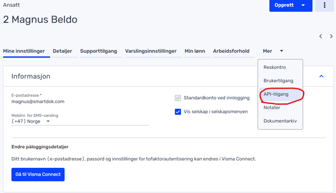 - I ansattprofilen, naviger til seksjonen API-tilgang.