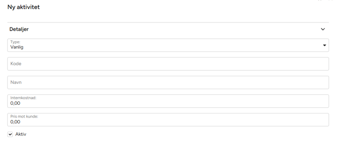 Fyll ut informasjon om aktiviteten, som type, kode, navn, pris mot kunde og internkostnad.