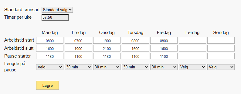 - Minimumskrav: Minst én dag må ha både start- og sluttid definert.