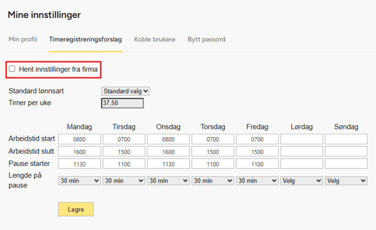 - Gå til Mine innstillinger → Timeregistreringsforslag.