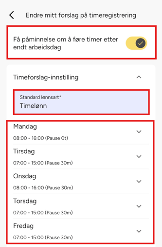 - Aktiver Få påminnelse om å føre timer etter endt arbeidsdag.
