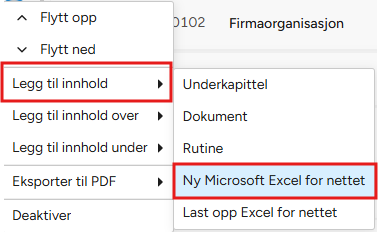 - Velg Legg til nytt innhold og deretter Ny Microsoft Excel for nettet.