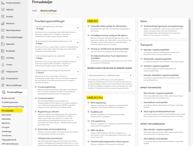 - Gå til Firmainnstillinger → Firmadetaljer → Modulinnstillinger.
