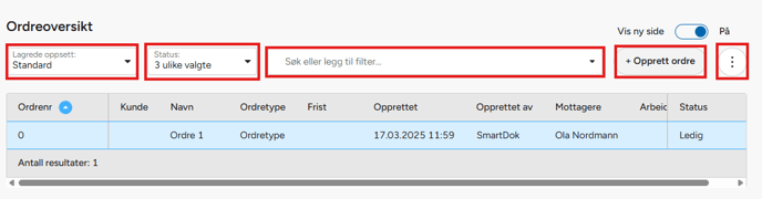 Ordreoversikt er en del av Ordrer-modulen i SmartDok og gir en samlet visning over alle opprettede ordrer på firmakontoen. Her kan du søke, filtrere, se detaljer og tilpasse visningen etter behov.