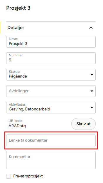 I SmartDok kan du knytte dokumenter til prosjekter, slik at de blir tilgjengelige for brukere direkte i appen. Dette gjøres ved å legge inn en lenke til en skybasert tjeneste.