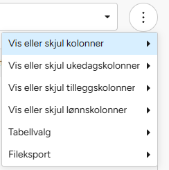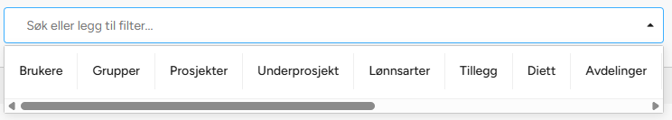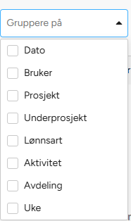 - Gruppering: Dato, bruker, prosjekt, underprosjekt, lønnsart, aktivitet, avdeling eller uke.