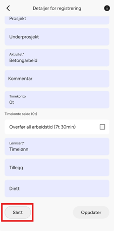 - Se hjelpevideo for hvordan du sletter en timeføring i appen HER.