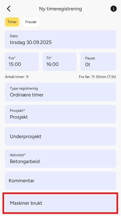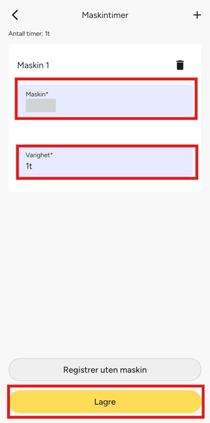 - Velg hvilken maskin som er brukt og antall timer og minutter.