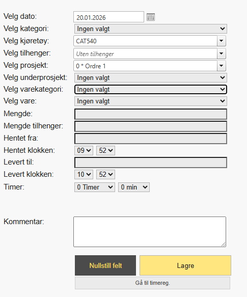 Fyll ut nødvendige felter, som dato, kjøretøy, prosjekt osv. (se oversikt nedenfor).