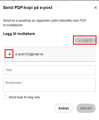 - Trykk på +Legg til for å legge til e-postmottaker. Trykk på +-tegnet for å lagre.