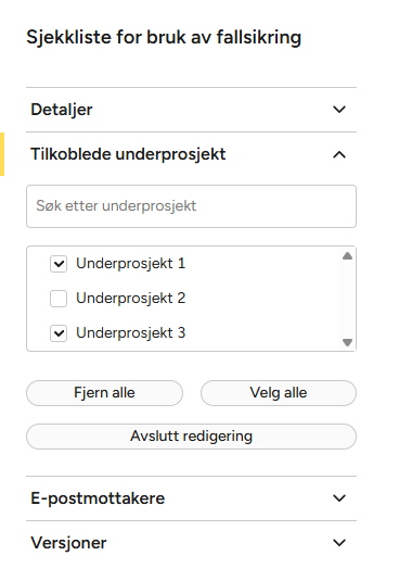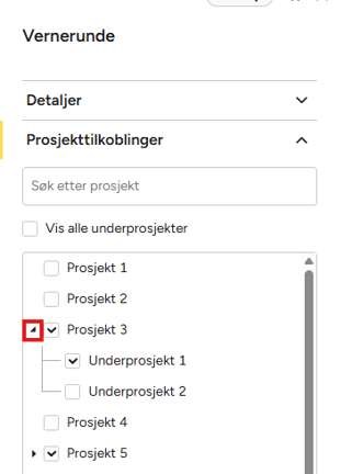 - Trykk på det sorte pil-ikonet foran et prosjektnavn for å vise tilknyttede underprosjekter. Her kan du velge underprosjekter som skal være koblet skjemamalen.
