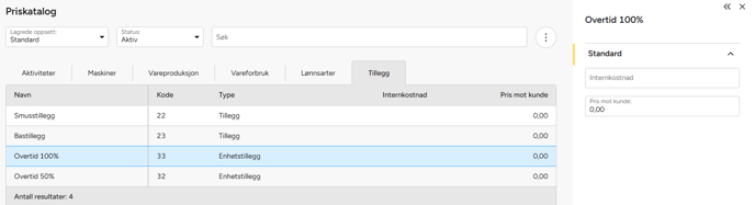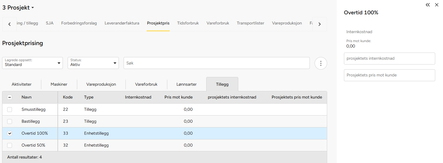 • Dersom det ikke er satt en prosjektpris, brukes i stedet standardprisen fra priskatalogen eller lønnsarten/tilleggets detaljer.