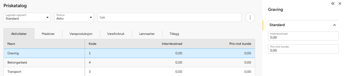 Standardpris legges inn i priskatalogen. Denne gjelder for alle prosjekter.