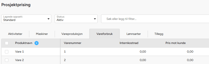 Hvordan sette standardpris og prosjektspesifikke priser på vareforbruk og vareproduksjon?