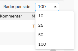 - I selve tabellen kan du også velge hvor mange rader du ønsker å vise per side (10, 20, 50 eller 100).