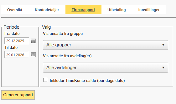 Gå til Firmainnstillinger → Timekonto → Firmarapport.