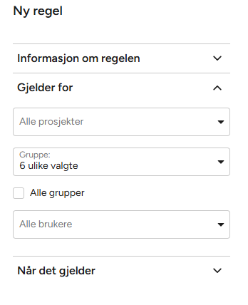 For å begrense regelen til spesifikke prosjekter, velg disse i nedtrekkslisten. - Grupper: Standard er at regelen gjelder for Ingen gruppe (Regelen gjelder for alle grupper)