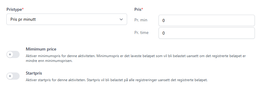 - Velg pristype Pris pr. minutt og definer prisen pr. min eller pr. time.