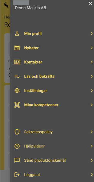 Användarmenyn i SmartDok-appen