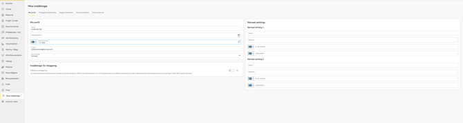 I SmartDok kan varje användare uppdatera sin personliga information under Mina inställningar → Min profil, både på webben och i appen. Här finns en översikt över dina kontaktuppgifter, språkval, ID06-kort, närmaste anhöriga samt möjlighet att ändra lösenord.
