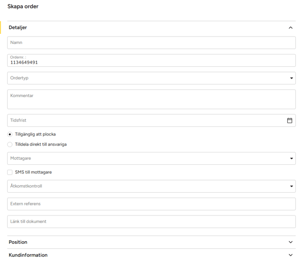 Tillgänglig för plockning: Välj om ordern ska vara tillgänglig för plockning av mottagare. Välj mottagare från listan och om SMS ska skickas till mottagarna.