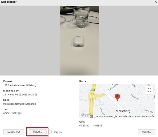 Bilder som har skickats in via projekt eller formulär kan raderas via webbversionen. Funktionen är endast tillgänglig för användare med rollen Administratör.