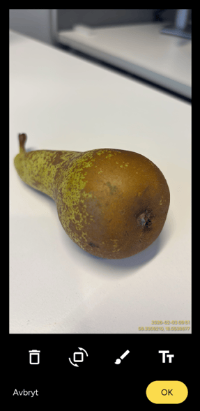 När du har tagit en bild, antingen direkt med kameran eller från ditt galleri, kan du redigera bilden vidare med hjälp av rit-/skissverktyget. Med detta verktyg kan du lägga till text på bilden, rita på bilden eller rotera bilden.